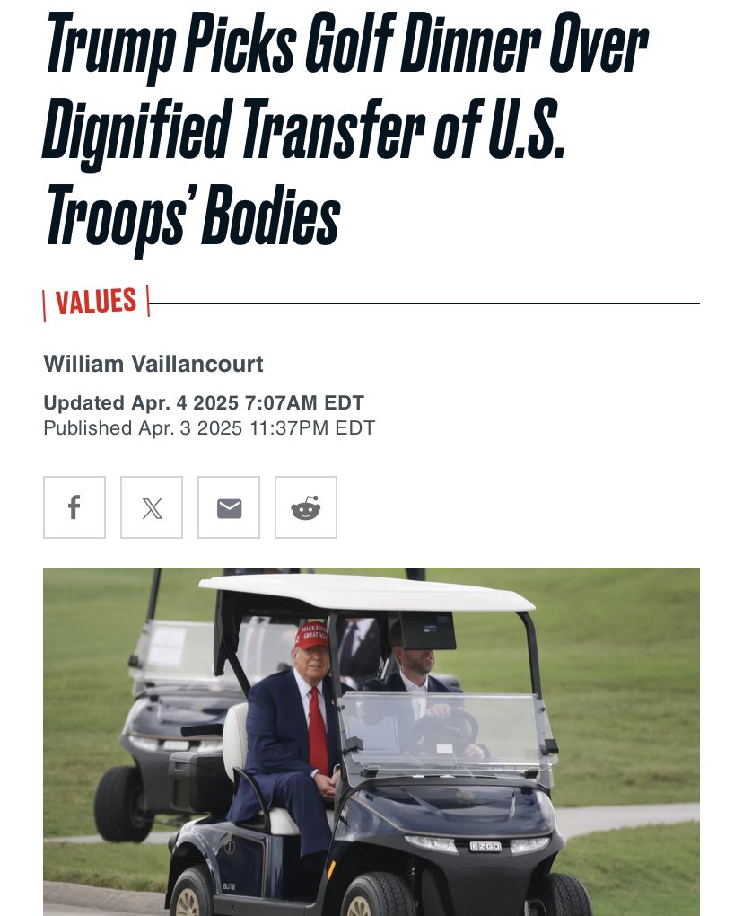 Felon abandons fallen soldiers, goes golfing instead.. He was supposed to meet coffins of 4 fallen US soldiers who died in an accident in Lithuania - meeting them at Dover Air Force Base as presidents traditionally do Instead hes going to Florida - so he can golf