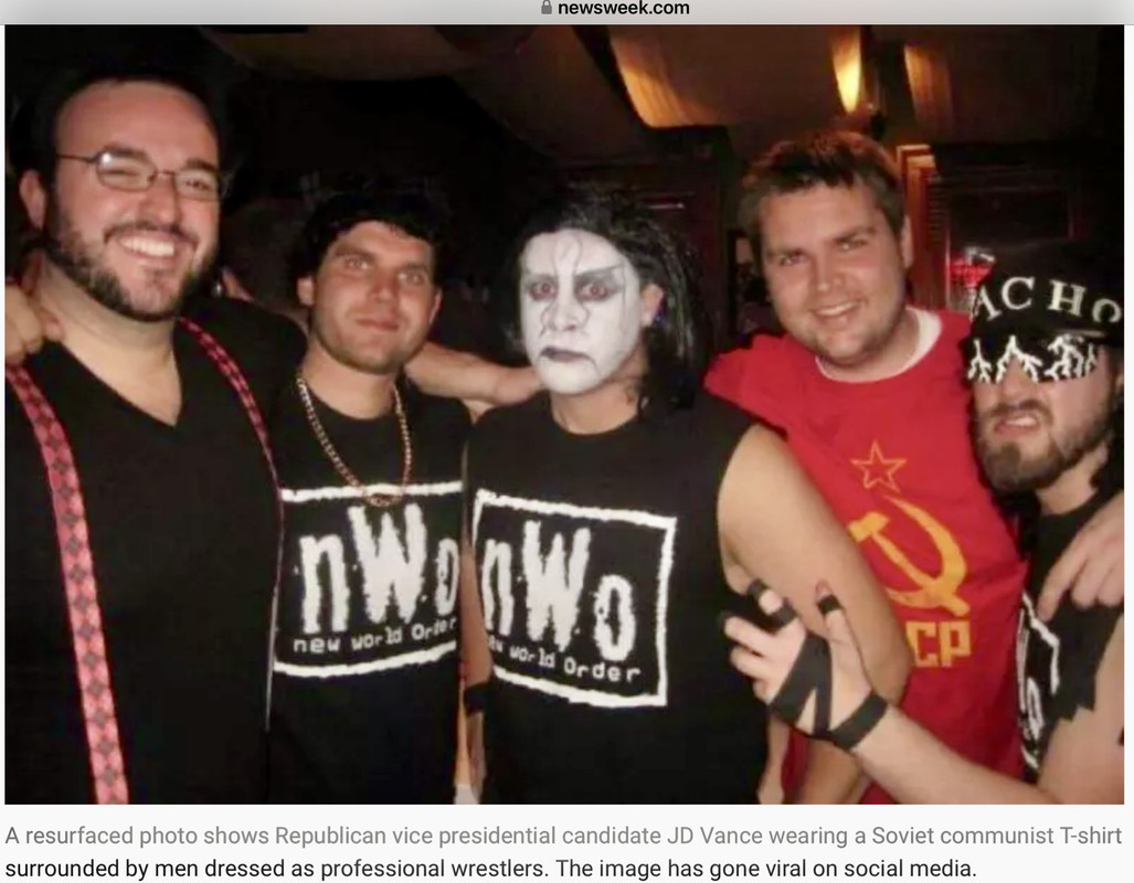 "The image was posted to X/Twitter by user @clliday on July 24, showing Vance in the garment surrounded by four men, three of whom are dressed as professional wrestlers at what appears to be a costume party."
