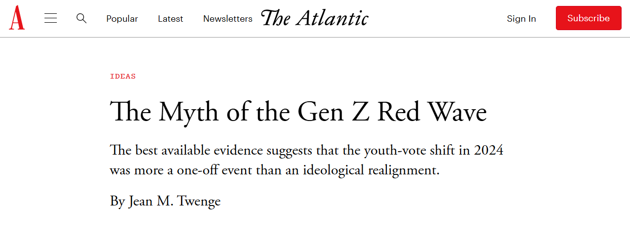 If Shor is rightif Gen Z (now ages 12 to 30) is durably to the right of previous generationsa significant part of the Democratic coalition is gone. Luckily for the party, however, he probably isnt. The best available evidence suggests that the youth-vote shift in 2024 was more a one-off event than an ideological realignment.