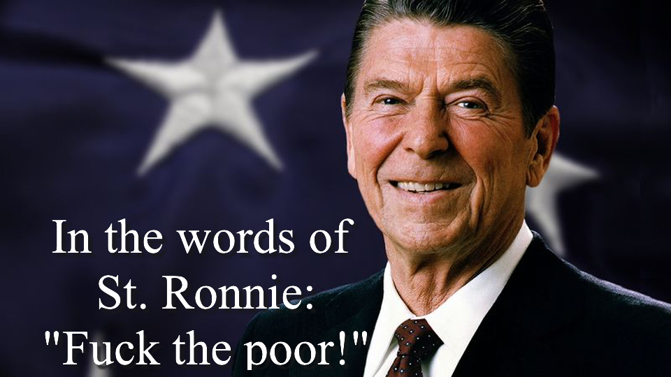 Fucking Reagan and his trickledown welfare queen bullshit. Forty five years of cannibalism by republicans on democracy and the middle class and my tribe of blue collar oppressed white men bought into the republican lies right up to today.