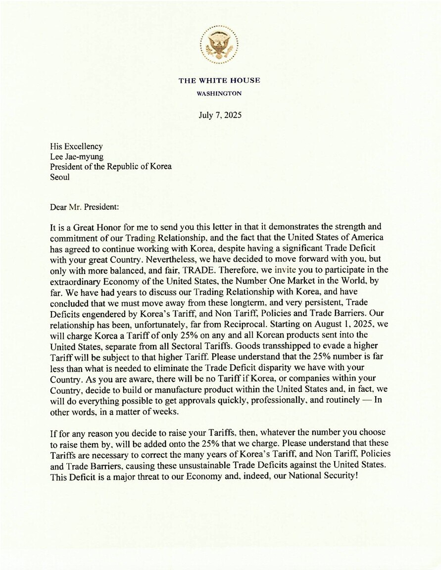 In the first letters, published on Monday, local time, Mr Trump told Japan's Prime Minister Shigeru Ishiba and South Korea's President Lee Jae-myung that the 25 per cent tariffs would be for all goods and separate from sector-specific tariffs.
