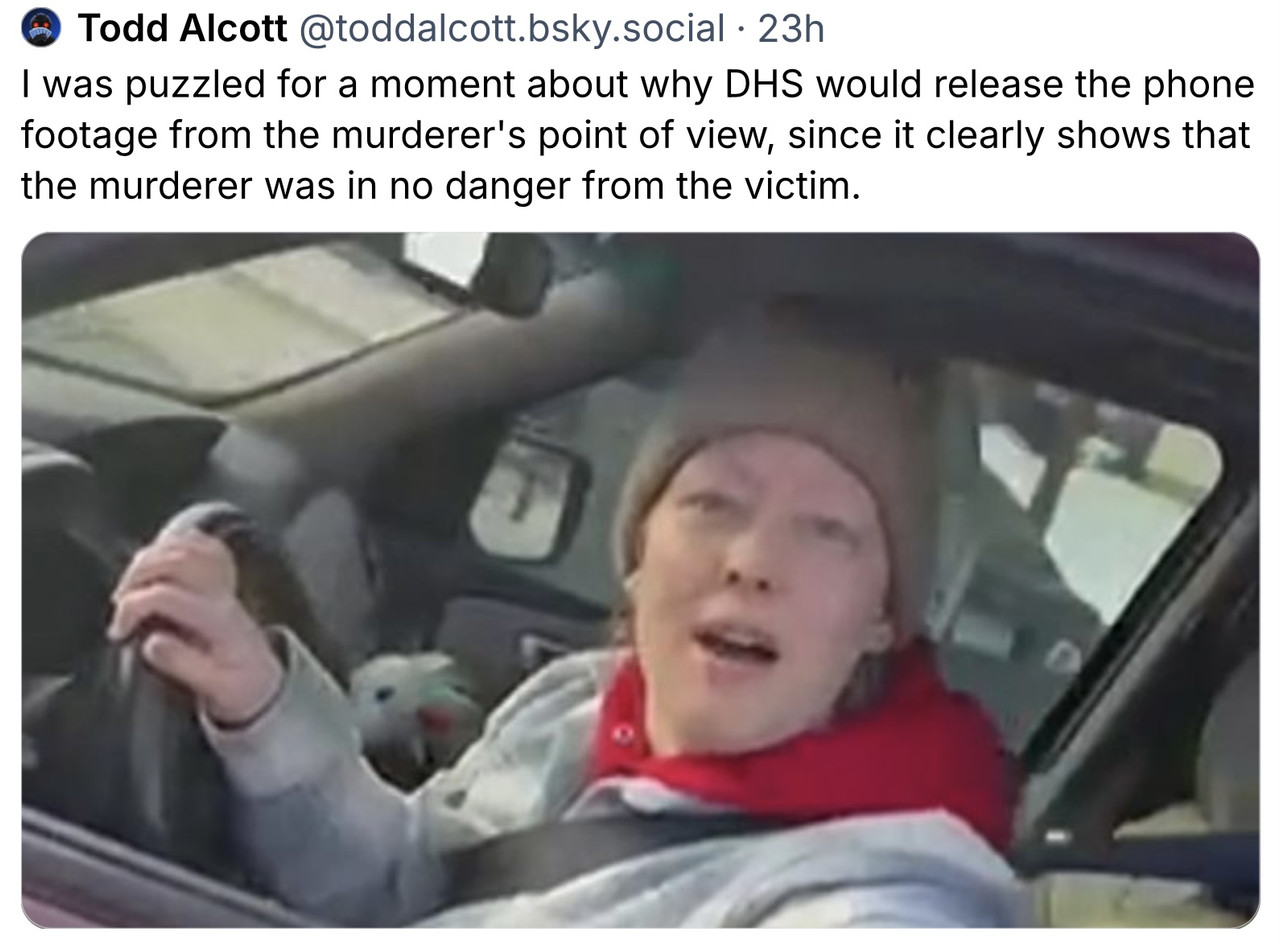 On Wednesday, Renee Good was not going to get away. I don't know what she did to garner his interest. He certainly wasn't explaining what the problem he had with her. When his colleagues rolled up and tried to open Renee's door, he made up his mind right then she wasn't going to be allowed to leave. He executed her to exert his power. Whatever she did, she didn't deserve the death penalty. She did not use her vehicle to try to hurt him. He was an arm's length away from her vehicle as he was shooting. He put his colleagues in the line of fire. This man is clearly out of control, bent on exerting his power, and he doesn't care who he kills. He got away rather quickly after walking up and down the street at the scene of the crime.
