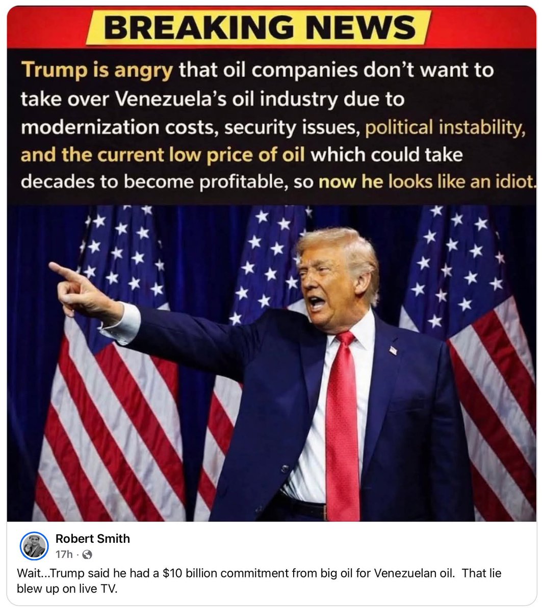 (35,694 posts)big oil, as they are sometimes referred to, is not interested in tossing in good money after bad. This is all Trump; HE wants to profit off of that oil. So, he is doing his usual shakedown like he did to the universities and big law. He wants them to start up operations, and then he will demand his cut. So far it looks like they are not amused.