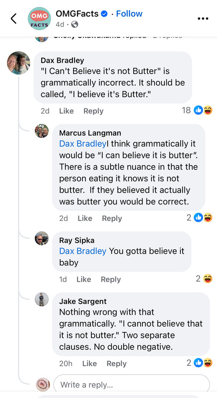 Related: Culture Forums, Support ForumsLet's go down the grammar hole. Is "I Can't Believe It's Not Butter" correct ?