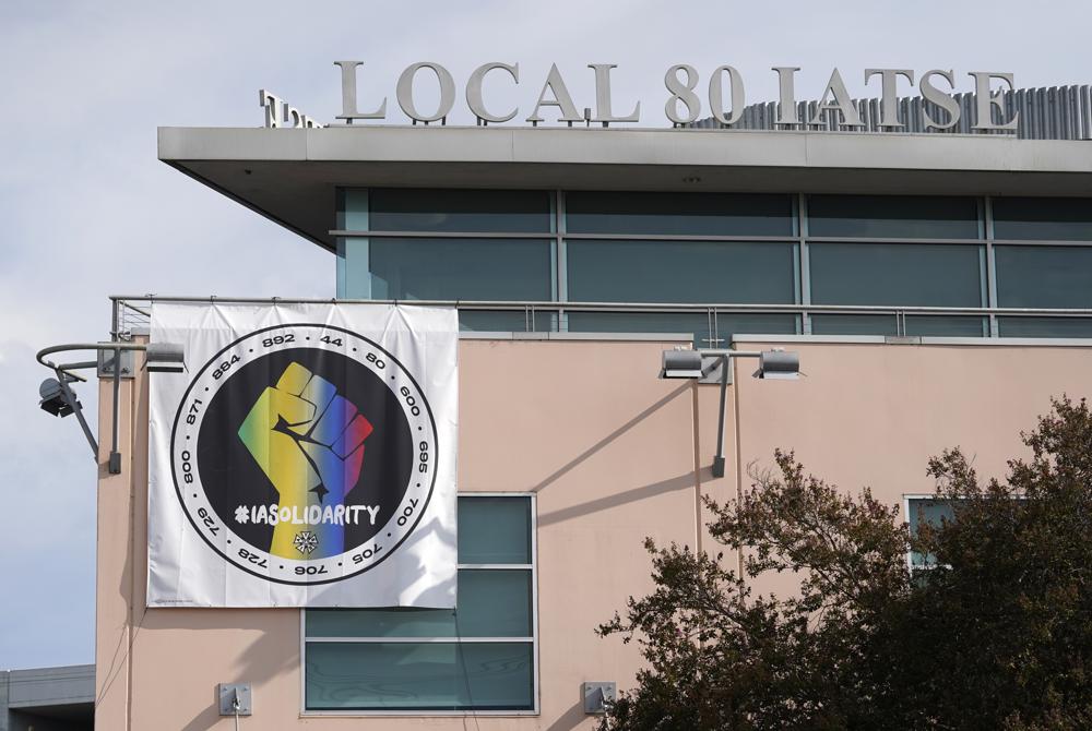 A poster advocating union solidarity hangs from the office building housing The International Alliance of Theatrical Stage Employees Local 80, Monday, Oct. 4, 2021, in Burbank, Calif. The IATSE overwhelmingly voted to authorize a strike for the first time in its 128-year history. (AP Photo/Chris Pizzello)